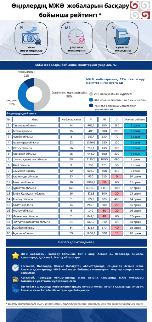 Рейтинг №52 Ереже шеңберінде бекітілген жаңартылған әдіснаманың негізінде есептелген. Бұл ретте, есепті кезеңнің басталуына байланысты МЖӘ жобаларын жоспарлау және іске асыру ережелерінің жаңартылған редакциясы күшіне енген сәтте мониторинг бойынша есептерді ұсыну мерзімдері №725 ережеге сәйкес ескерілді.
